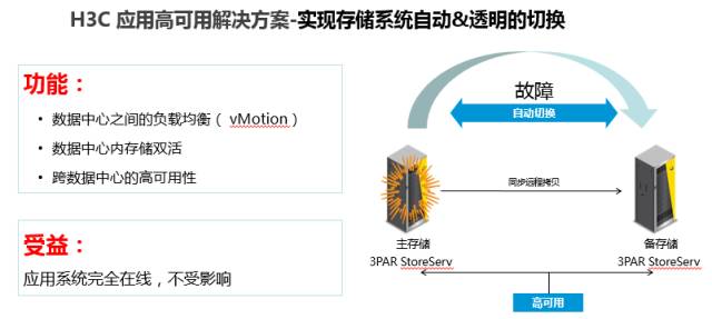 對于這一點,新華三推出了應用高可用解決方案。這一方案的重點就是實現(xiàn)存儲系統(tǒng)自動、透明的切換。通過數(shù)據(jù)中心之間的負載均衡、數(shù)據(jù)中心內存儲雙活、跨數(shù)據(jù)中心的高可用性等功能,讓金融應用系統(tǒng)可以忽略外部故障影響,完全在線。